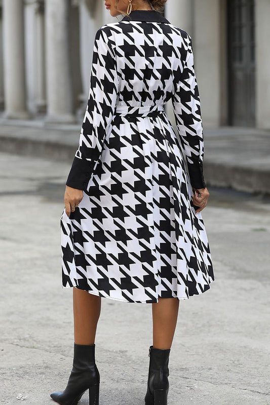 Houndstooth Johnny Collar Tie Waist Dress