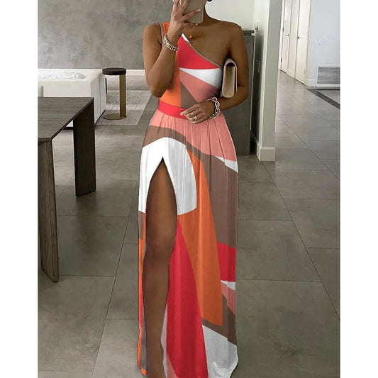 Colorblock OneShoulder High Slit Maxi Dress