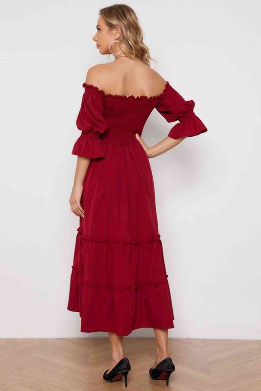 Off-Shoulder Flounce Sleeve Frill Trim Tiered Dress