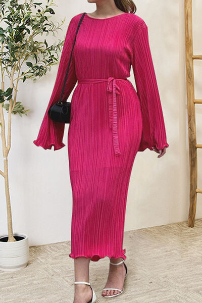 Textured Tied Round Neck Long Sleeve Dress