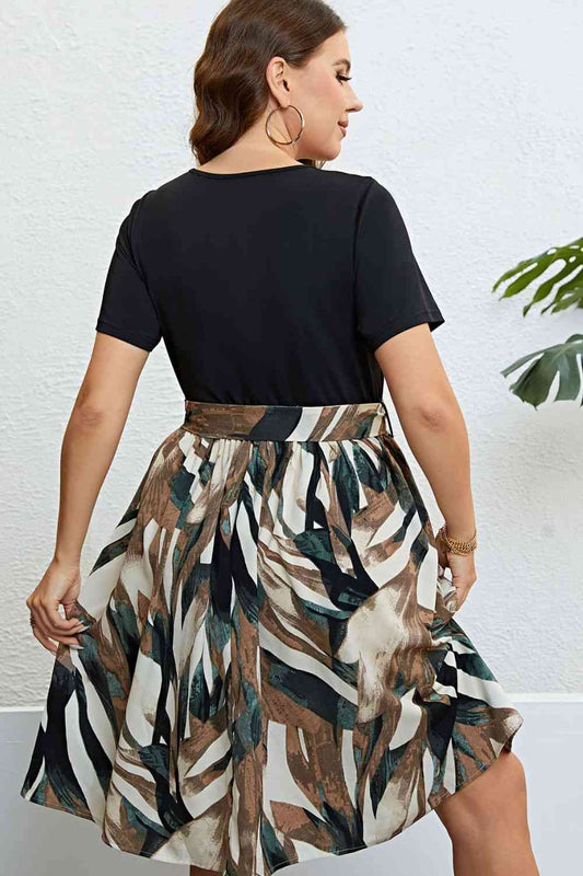 Melo Apparel Plus Size Printed Tie Belt Flare Sleeve Round Neck Midi Dress