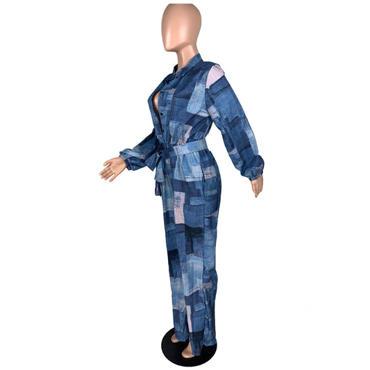 Faux Denim Print Loose Belt Wide-Leg Loose Jumpsuit