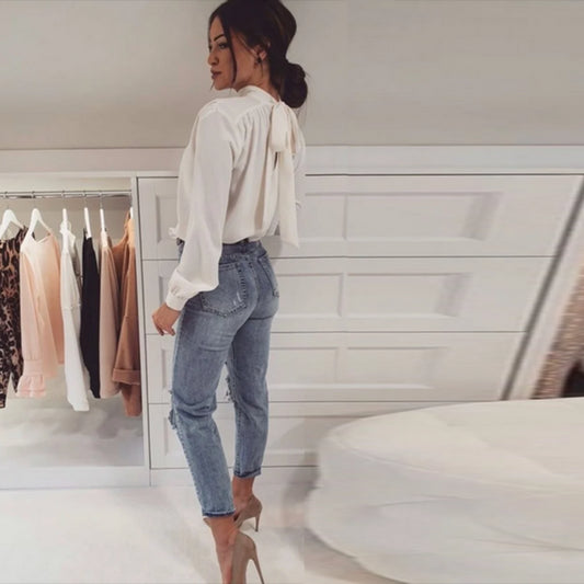 2021 autumn new women's shirt white shirt V-neck slim long-sleeved chiffon shirt