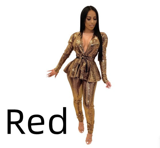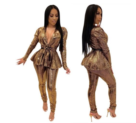 Slim Fit Fashion Bronzing Cloth Long Sleeve Suit With Belt